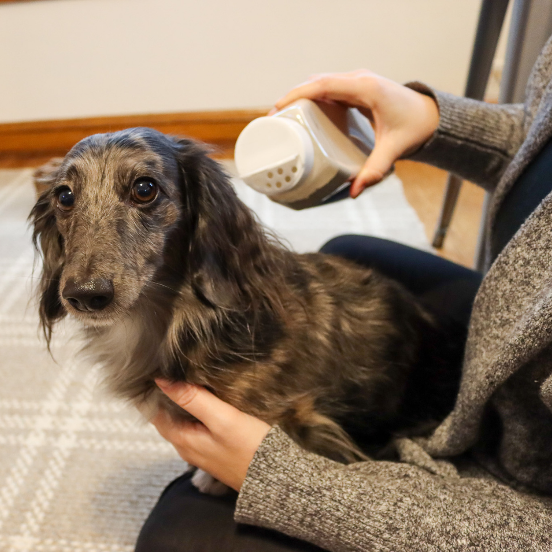 Formulated with mineral absorbents, plant-based ingredients, and essential oils, Coat Refresher™ naturally absorbs dirt, oil, and odors while being completely non-toxic and safe for pets and people. Whether you’re tackling tear stains, wrinkly skin folds or post-potty clean-ups, this easy-to-use powder will leave your pet looking and smelling fresh—because every pup deserves a clean, happy coat!